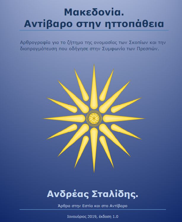 Περισσότερες από 200 σελίδες με όλη την αρθρογραφία του από τον Ιανουάριο του 2018 μέχρι τον Ιανουάριο του 2019 στην εφημερίδα Εστία και στο ηλεκτρονικό περιοδικό Αντίβαρο. Πλήθος ιστορικών στοιχείων από την αρχαιότητα μέχρι σήμερα, ιχνηλάτηση των ριζών του Μακεδονικού ζητήματος από το 1864 μέχρι σήμερα, αναφορές στην περίοδο 1878-1913 και στην αντιπαλότητα Ελλήνων και Βουλγάρων για την Μακεδονία, ιστορικά ντοκουμέντα από εφημερίδες, βιβλία, ημερολόγια της εποχής, στοιχεία από την απογραφή των Σέρβων το 1921 που δεν καταγράφτηκε κανένας «Μακεδόνας», πολιτικές εξελίξεις της δεκαετίας του 1920 και αρνήσεις του ελληνικού Κοινοβουλίου να επικυρώσει την αναγνώριση των σλαβοφώνων ως βουλγαρική ή σερβική μειονότητα, ο ρόλος της Κομιντέρν (Κουμμουνιστική Διεθνής) και του ΚΚΕ. Πολιτικά επιχειρήματα για το ζήτημα της ονομασίας των Σκοπίων. Αποδόμηση όλων των γνωστών μύθων που αναπαράγονται από όσους υποστηρίζουν τον κακό και βλαβερό συμβιβασμό για τον ελληνισμό. Λεπτομερής ανάλυση της Συμφωνίας των Πρεσπών άρθρο-άρθρο. Επιστολές σε πολιτικούς με σύνοψη των λόγων που πρέπει να ακυρωθεί το πλαίσιο συμφωνίας που υπεγράφη στις Πρέσπες. Στο παράρτημα του ηλεκτρονικού βιβλίου θα βρείτε ολόκληρη την Συμφωνία των Πρεσπών σε ελληνικά και αγγλικά, και ολόκληρη την Συνθήκη Ειρήνης του Βουκουρεστίου του 1913 επίσης στα ελληνικά και αγγλικά. Πάνω από 30 άρθρα δημοσιευμένα στην Εστία και στο Αντίβαρο. Το ηλεκτρονικό αυτό βιβλίο διατείθεται δωρεάν για όλους σε μορφή pdf.