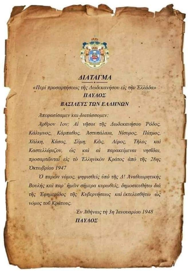 Υγ. Δεν ξέρω τι εικόνα να συνοδεύσει αυτό το κείμενο. Επειδή θεωρώ ότι το ηθικό είναι παράγοντας ισχύος, δεν θα βάλω καμία μίζερη εικόνα είτε της Τουρκίας, είτε του Ερντογάν, είτε των λεγόμενων “Τούρκων εσωτερικού”, είτε κανενός καημένου κυβερνητικού με ύφος ζήτουλα έτοιμου να παραχωρήσει δικαιώματα κυριαρχίας για να παραλάβει προσωρινή ειρήνη. Έτσι, έπεσε μπροστά μου αυτό που βλέπετε, από την προσάρτηση των Δωδεκανήσων στην Ελλάδα μετά τον 2ο παγκόσμιο πόλεμο. Παντελώς άσχετο με το θέμα, αλλά τουλάχιστον αναπτερώνει το ηθικό.