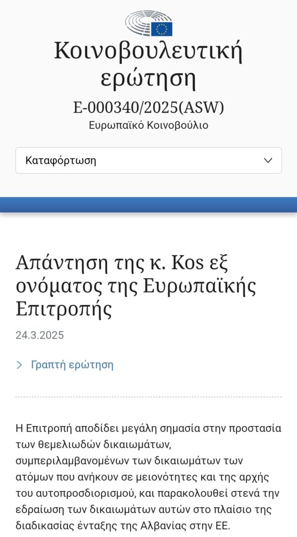 Απάντηση της Ευρωπαϊκής Επιτροπής στον ευρωβουλευτή Νίκο Αναδιώτη για το δικαίωμα αυτοπροσδιορισμού της ελληνικής μειονότητας της Βορείου Ηπείρου.