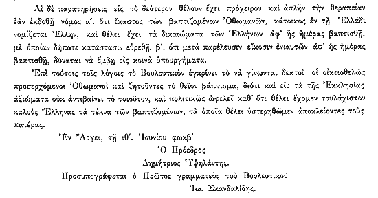 Στις 19 Ιουνίου 1822, το Βουλευτικό υπό τον Δημήτριο Υψηλάντη επιθυμεί να ψηφιστεί νόμος που θα δίνει ίσα δικαιώματα στους βαπτιζόμενους Οθωμανούς ( μουσουλμάνους ), μέχρι και υπουργήματα να λαμβάνουν μετά από κάποιο διάστημα, ενώ προσβλέπει και στα παιδιά τους ως καλούς Έλληνες .