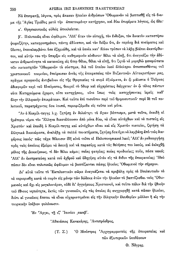 Μουσουλμάνοι και Εβραίοι που βαπτίστηκαν χριστιανοί ( νεοφώτιστοι ) , παρά τις επιφυλάξεις , έγιναν έλληνες πολίτες και μάλιστα εγκρίθηκαν αποζημιώσεις τους για τις ζημιές που υπέστησαν κατά τη διάρκεια του αγώνα του 1821. Ομοίως εγκρίθηκαν αποζημιώσεις και για τους Μουσουλμάνους που δεν άλλαξαν θρήσκευμα, αλλά πολέμησαν στο πλευρό των Ελλήνων κατά των Οθωμανών.