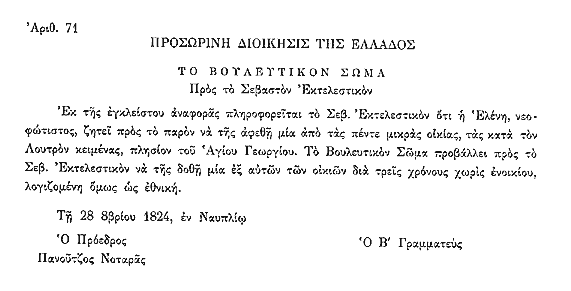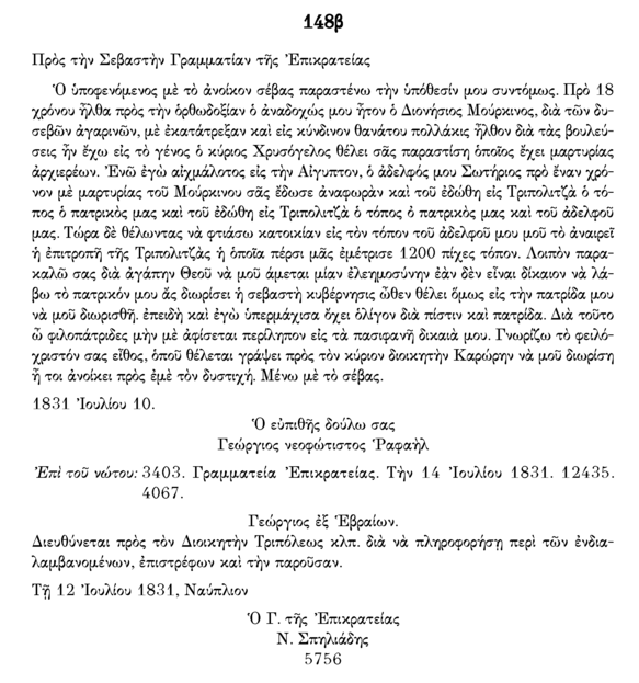 Ο επίσης «νεοφώτιστος» χριστιανός εξ εβραίων Ραφαήλ ( ήδη Γεώργιος ), ζητεί παραπονούμενος από την Κυβέρνηση να του παραχωρηθεί πατρογονική γη στην Τριπολιτζά, που του αρνείται η τοπική επιτροπή.