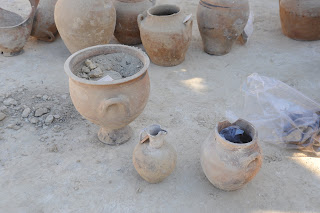 Μετά από αυτή τη “μυσταγωγία” της ανάσυρσης από τον τάφο όλων των κτερισμάτων, τα τοποθετήσαμε ευλαβικά το ένα δίπλα στο άλλο πριν μεταφερθούν στο εργαστήριο. Πραγματικά εδώ είχαμε όχι μόνο την ευκαιρία να φωτογραφίσουμε τις λεπτομέρειες αλλά να αγγίξουμε και το περιεχόμενό τους….. τα υπολείματα καύσης, τις χαντρες, τις περόνες κλπ. αλλά και να τα μελετήσουμε (στο βαθμό που επιτρέπουν οι γνώσεις μας).
