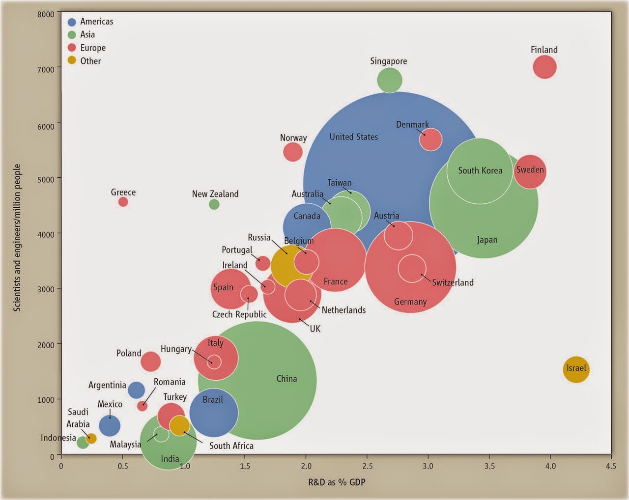 Το δεύτερο σχήμα προέρχεται από το δικτυακό τόπο του έγκριτου επιστημονικού περιοδικού Science [5]. Εδώ βλέπουμε τον αριθμό των ερευνητών κάθε χώρας σε σχέση με τα χρήματα που ξοδεύει η χώρα στην έρευνα και ανάπτυξη. Παρατηρούμε ότι αναλογικά η Ελλάδα έχει αριθμό ερευνητών ίδιο με χώρες όπως οι ΗΠΑ, Ιαπωνία, Δανία, Αυστρία, Καναδάς και άλλες ενώ περνάμε χώρες όπως η Γερμανία, Γαλλία, Ισπανία και άλλες. Αλλά, ΜΟΝΑΧΙΚΟ ΣΗΜΕΙΟ στο διάγραμμα, η Ελλάδα πληρώνει το 1/6 του ποσού, ως ποσοστό του ΑΕΠ, για την έρευνα. Μάλιστα αν αναλογιστεί κανείς πως το ΑΕΠ/κάτοικο στις χώρες αυτές είναι αρκετά υψηλότερο στις χώρες αυτές ενώ το κόστος έρευνας ίδιο ή και μεγαλύτερο, βλέπουμε πως το ποσό μικραίνει ακόμα περισσότερο.
