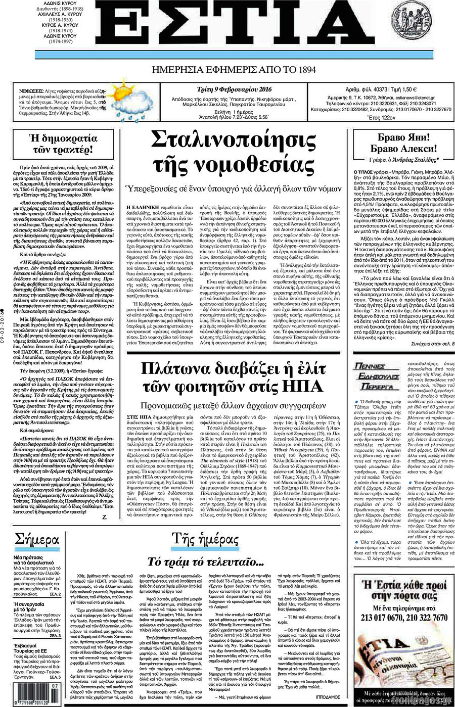Το πρωτοσέλιδο της Εστίας 9.2.2016
