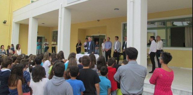 Τώρα, σταθείτε όλοι σε στάση προσοχής για να υψώσουμε την Ελληνική σημαία και να τραγουδήσουμε τον εθνικό ύμνο. Μιας και κάποιοι από εσάς δεν ξέρετε τα λόγια, οι δάσκαλοί σας θα σας δώσουν τους στίχους.
