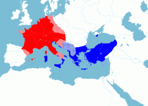 Αυτές οι εξελίξεις οδήγησαν στην τελική πολιτική χειραφέτηση της παποσύνης από το βυζαντινό κράτος. Υπό την ασφυκτική πίεση των Λογγοβάρδων ο πάπας Στέφανος Β’ κατέφυγε στη βοήθεια των Φράγκων (752). Ο βασιλεύς Πεπίνος και ύστερα ο γιος του Καρλομάγνος συνέτριψαν τους εχθρούς του πάπα και του παρέδωσαν τις ανακτηθείσες βυζαντινές επαρχίες του Λατίου και της Πενταπόλεως ως δικό του, αυτόνομο κράτος. Η ανερχόμενη φραγκική αυτοκρατορία, έχοντας κυριαρχήσει σε μεγάλα τμήματα της κεντρικής και δυτικής Ευρώπης, προκάλεσε τη βυζαντινή κοσμοθεωρία κηρύσσοντας εαυτόν διάδοχο της δυτικής Ρώμης, με τη στέψη του Καρλομάγνου ως αυγούστου τα Χριστούγεννα του έτους 800, από τον πάπα Λέοντα Γ’. Πλέον είχε δημιουργηθεί ένα ανταγωνιστικό και εναλλακτικό Reich με το δικό του Großraum, όχι μόνο αμφισβητώντας τη νομιμοποίηση και την ταυτότητα των ανατολικών αλλά και ανατρέποντας το πολιτικοστρατιωτικό καθεστώς της Ιταλίας, μήτρας της ρωμαϊκότητος. Τα επόμενα χρόνια οι βυζαντινές κτήσεις εκεί θα περιοριστούν στον απώτατο νότο (παλαιά Μεγάλη Ελλάς-Απουλία, Καλαβρία), ενώ οι Φράγκοι θα καταστρέψου τη Βενετία και τις δαλματικές ακτές. Την πρώτη αυτή περίοδο ανταγωνισμού των δύο αυτοκρατοριών (752-814), ο διαφιλονικούμενος χώρος ορίζεται στην περιοχή Ιταλίας-βορειοδυτικών Βαλκανίων. Σε θρησκευτικό επίπεδο η φραγκική κάθοδος στη Ρώμη θα οδηγήσει στη διακοπή επικοινωνίας μεταξύ ελληνικών και λατινικής Εκκλησίας, στη λήθη της γλώσσας της μίας πλευράς από την άλλη και τη θεολογική απομάκρυνση. Σε αντίδραση στη βυζαντινή κυριαρχία αλλά και ως εγγύηση απέναντι στη νέα, φραγκική, η παποσύνη ανέπτυξε μία πολιτική θεολογία (βασισμένη σε φαλκιδεύσεις όπως η Κωνσταντίνειος Δωρεά και οι Ψευδοϊσιδώρειες Διατάξεις) ανεξαρτησίας αλλά και υπεροχής της Εκκλησίας απέναντι στη βασιλική εξουσία. Εκεί ξεκινά η διαρχία του δυτικού Reich.