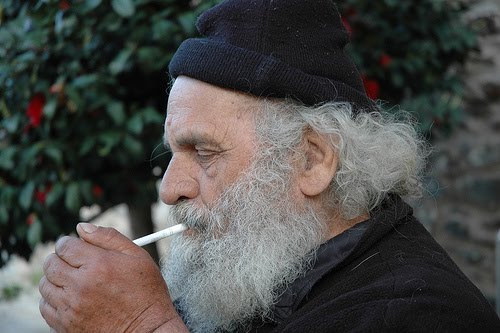 μοναχός του Αγίου Όρους, με το σκουφάκι του, κάνει ένα διάλειμμα στο περιβόλι του…