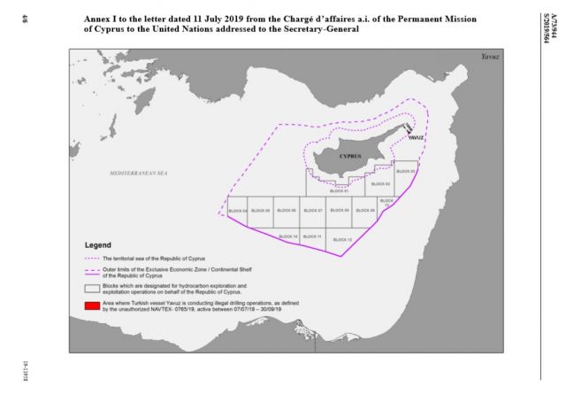 Κατόπιν οδηγιών της κυβέρνησής μου, και κατόπιν των επιστολών μου της 12ης Δεκεμβρίου 2018 (A/73/651) και της 19ης Φεβρουαρίου 2019 (A/73/753-S/2019/160) σχετικά με τις παράνομες δραστηριότητες εξερεύνησης υδρογονανθράκων που διεξήγαγε η Τουρκική Δημοκρατία στην υφαλοκρηπίδα και της αποκλειστικής οικονομικής ζώνης (ΑΟΖ) της Κύπρου, και ειδικότερα, κατόπιν της επιστολής της 2ας Μαΐου 2019 από τον Πρόεδρο της Κυπριακής Δημοκρατίας που απευθύνονταν στο πρόσωπο σας, είμαι υποχρεωμένη να σας πληροφορήσω για τις τελευταίες εξελίξεις όσον αφορά τη συνεχιζόμενη πρόκληση της Τουρκίας και παράνομες ενέργειες κατά της Κυπριακής Δημοκρατίας. Στρέφομαι πρώτα στις παράνομες επιχειρήσεις γεώτρησης της Τουρκίας στα Χωρικα υδατα της Κυπριακής Δημοκρατίας.