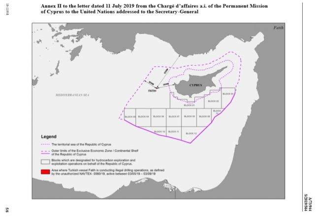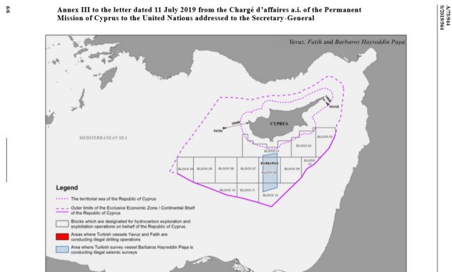 Η Επιστολή προς τον Γ.Γ. του ΟΗΕ και το ΣΑ του ΟΗΕ, η οποία δημοσιεύθηκε χθες ως επίσημο έγγραφο των Ηνωμένων Εθνών(με ημερομηνία 11 Ιουλίου), αποτυπώνει και καταγράφει όλο το πλαίσιο των παράνομων τουρκικών ενεργειών στην Κυπριακή, υφαλοκρηπίδα/ΑΟΖ και χωρικά ύδατα και αποδομεί την τουρκική επιχειρηματολογία περί δήθεν προστασίας των δικαιωμάτων των Τουρκοκυπρίων, ενώ επισημαίνεται ότι η Τουρκία αρνείται να αποδεχθεί την προσφυγή σε οποιοδήποτε διεθνές δικαστικό όργανο με το επιχείρημα ότι δεν δεσμεύεται από το Δίκαιο της Θάλασσας. Η επιστολή της Κύπρου συνοδεύεται και με χάρτες που αποτυπώνουν το μέγεθος των τουρκικών προκλήσεων.
