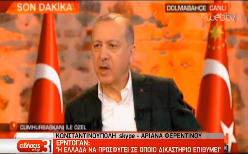Μπροστά στα εκατομμύρια τηλεθεατών ο Ερντογάν παραχώρησε προ ημερών Διακαναλική συνέντευξη κατά την οποία αναφέρθηκε μεταξύ άλλων στην πρόσφατη συνάντηση μιάμισης ώρας, όπως είπε, που είχε με τον κο Μητσοτάκη. Με βάση τα λεγόμενά του η Ελληνική πλευρά κατηγόρησε την Τουρκία πως παραβιάζει το διεθνές δίκαιο, ενώ η απάντηση που δόθηκε από τον Τούρκο Πρόεδρο ήταν «μπορείτε να προσφύγετε σε όποιο δικαστήριο θέλετε», δείχνοντας ευθέως με αυτές τις δημόσιες δηλώσεις την απαξίωσή του ακόμη και για το κατεξοχήν αρμόδιο δικαστήριο επίλυσης τέτοιων ζητημάτων που δεν είναι άλλο από το Διεθνές Δικαστήριο της Χάγης.