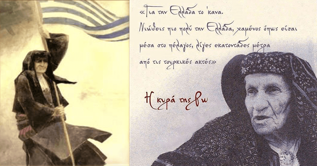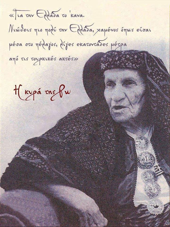 [penci_blockquote style=”style-3″ align=”none” author=””]«Τα ξερονήσια του Καστελόριζου και της Ρω τ’ αγαπώ. Έμεινα μόνη μου το 1943 στο Καστελόριζο με την τυφλή μου μάνα, όταν έφευγαν όλοι οι κάτοικοι του νησιού στη Μέση Ανατολή και στην Κύπρο. Με την Ελληνική σημαία υψωμένη και την αγάπη για την Ελλάδα βαθιά ριζωμένη μέσα μου πέρασα όλες τις κακουχίες. Βέβαια η ζωή στη Ρω δεν είναι και τόσο ευχάριστη, αλλά νιώθεις πιο πολύ την Ελλάδα, χαμένος όπως είσαι στο πέλαγος, λίγες εκατοντάδες μέτρα από τις Τουρκικές ακτές. Την Ελληνική Σημαία θέλω να μου τη βάλουν μαζί μου στον Τάφο»[/penci_blockquote]