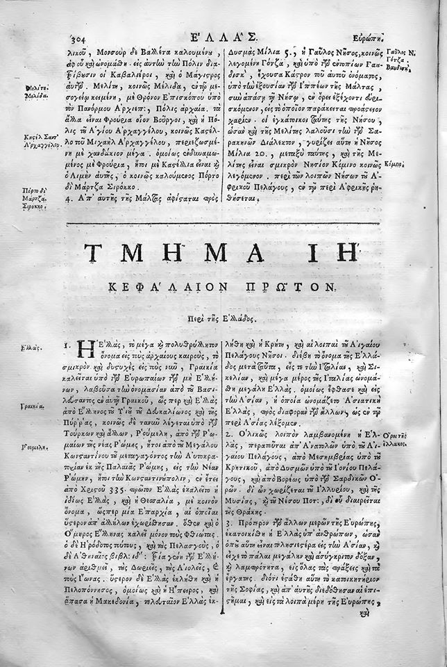 πρῶτον μὲν Ἑλλὰς ἐκαλεῖτο ἡ ἰδίως Ἑλλὰς, καὶ ἡ Θεσσαλία, μὲ κοινὸν ὄνομα, ὥσπερ μία Ἐπαρχία, αἱ ὁποῖαι ὕστερον ὑπ’ ἀλλήλων ἐχωρίσθησαν, ὅθεν καὶ ὁ Ὅμηρος Ἕλληνας καλεῖ μόνον τοὺς Φθιῶτας, ὁ δὲ Ἡρόδοτος τούτους καὶ τοὺς Πελασγούς, ὁ δὲ Ἀθήναιος τρία γένη τῶν Ἑλλήνων ἀριθμεῖ, τοὺς Δωριεῖς, τοὺς Αἰολεῖς καὶ τοὺς Ἴωνας.