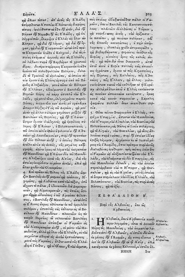 Οὕτω τοίνυν θεωρουμένη ἡ Ἑλλάς, περιέχει Ἐπαρχίας, Ἅπασαν τὴν Μακεδονίαν, τὴν Ἤπειρον, τὴν Αἰτωλίαν, τὴν Β[ο]ιωτίαν, τὴν Πελοπόννησον, τὰς Νήσους τοῦ Ἰονίου πελάγους καὶ τοῦ Αἰγαίου, τὴν Θεσσαλίαν, καὶ εἴ τις ἄλλη εἶναι παρὰ αὐτάς, περὶ τῶν ὁποίως ἰδίως ἐφεξῆς λέξομεν, ἀρχόμενοι ἐκ τοῦ λοιποῦ μέρους τῆς Ἰλλυρίδος, ὅπου πρότερον περὶ αὐτῆς διαλαβόντες ἐστάθημεν.