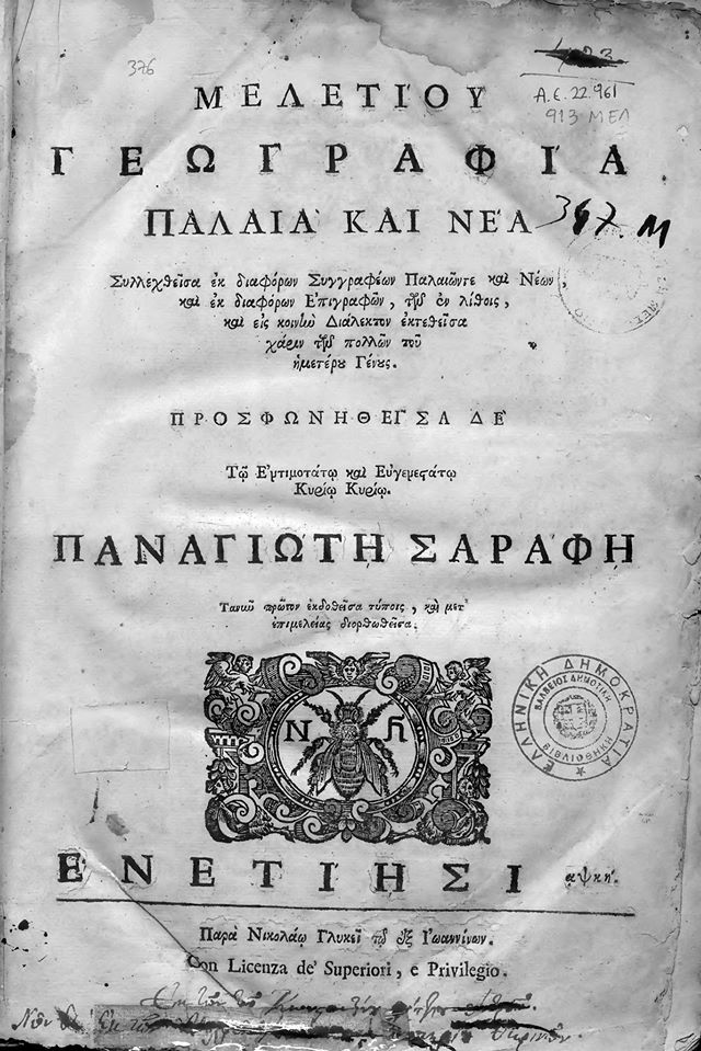 Το τετράτομο γεωγραφικό έργο του Επισκόπου Αθηνών Μελετίου Β΄ (γεννήθηκε στα Ιωάννινα το 1661 και πέθανε στην Κωνσταντινούπολη το 1714), με τίτλο