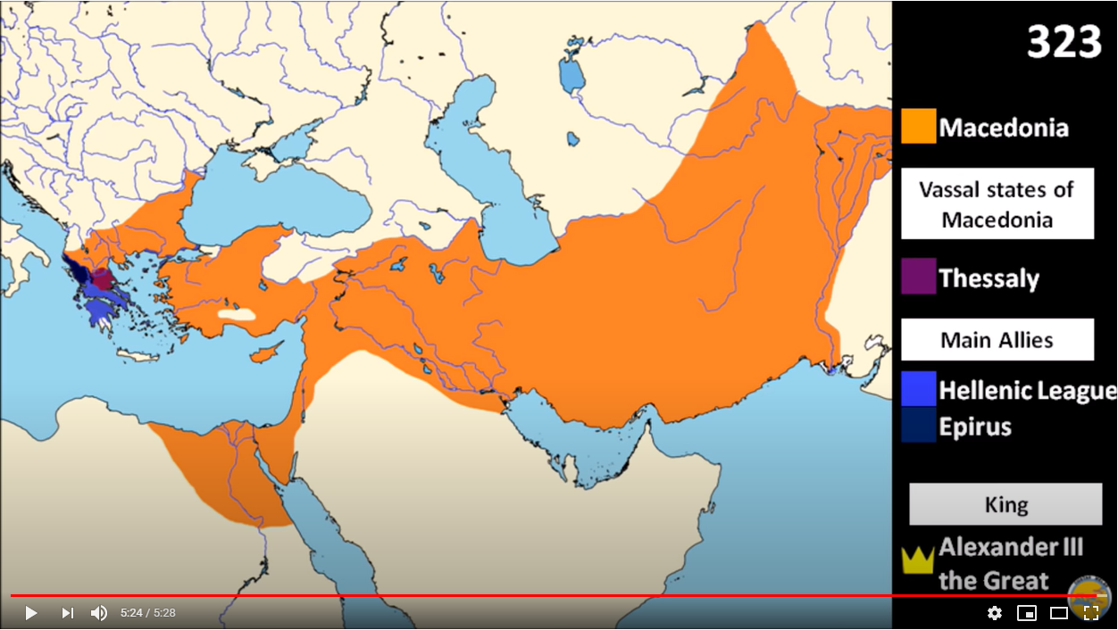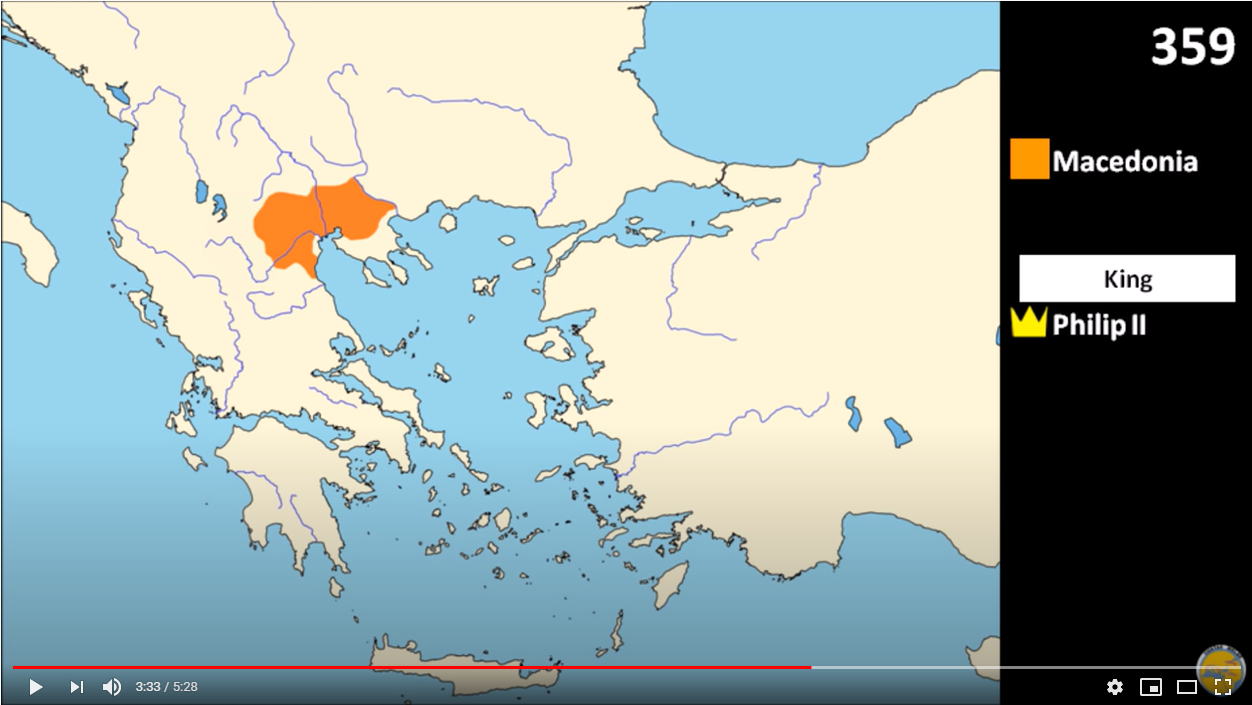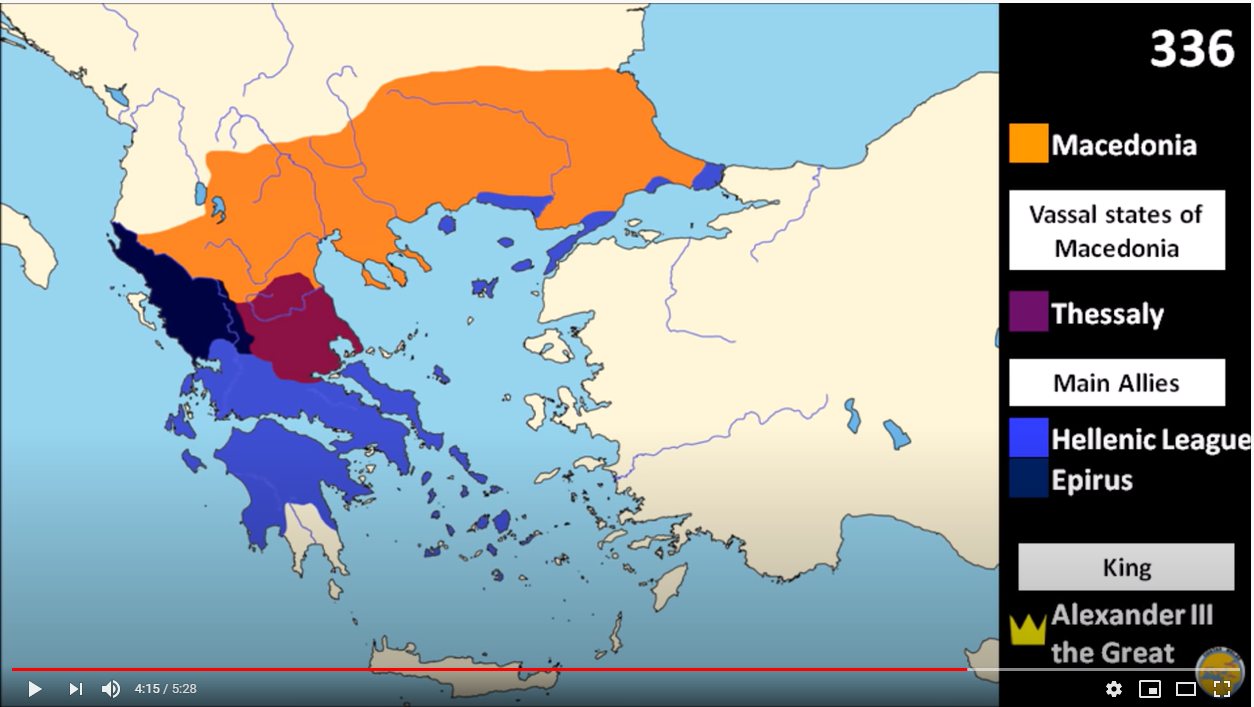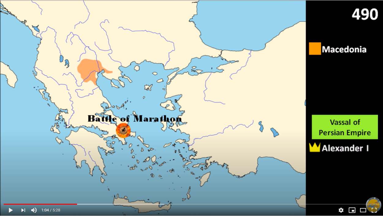 Στις παρακάτω εικόνες από το πρώτο βίντεο βλέπουμε, τι παρέδωσε ο Μέγας Αλέξανδρος (ΙΙΙ) το 323 π.Χ., τι παρέλαβε από τον Φίλιππο ΙΙ το 336 πΧ, τι είχε παραλάβει ο Φίλιππος το 359 πΧ, και την Μακεδονία το 490πΧ, τη χρονιά της Μάχης του Μαραθώνα, επί του Αλεξάνδρου Ι.