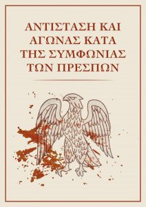 Η φράση «ΑΝΤΙΣΤΑΣΗ ΚΑΙ ΑΓΩΝΑΣ ΚΑΤΑ ΤΗΣ ΣΥΜΦΩΝΙΑΣ ΤΩΝ ΠΡΕΣΠΩΝ» υπάρχει και σε αφίσα που έχουμε σχεδιάσει και η οποία βρίσκεται στην ιστοσελίδα μας «epitropiellinismou.gr». Στην αφίσα αυτή επίσης υπάρχει ο αετός της αιματοβαμμένης μακεδονικής σημαίας του Πισοδερίου. Είναι η σημαία που έφερε πάνω του ο Χρόνης Κεφαλάς στη διαμαρτυρία κατά της υπογραφής της Συμφωνίας των Πρεσπών στο Πισοδέρι στις 17 Ιουνίου 2018 και η οποία βάφτηκε με το αίμα του μετά από τον ξυλοδαρμό που δέχτηκε από τα ΜΑΤ της κυβέρνησης ΣΥΡΙΖΑ-ΑΝΕΛ. Η συγκεκριμένη σημαία είναι η σημαία των μακεδονικών συνταγμάτων των αρχαίων Μακεδόνων. Όπως αναφέρει ο Νικόλαος Ζαφειρίου στο βιβλίο του Η ελληνική σημαία, αυτές οι σημαίες «ἦσαν κυαναί μέ λευκόν τό παλαιόν Μακεδονικόν σύμβολον, τόν ἀετόν»4. Η σημαία αυτή είναι η πρώτη γαλανόλευκη σημαία των Ελλήνων. Είναι πλέον γνωστή ως «η αιματοβαμμένη μακεδονική σημαία του Πισοδερίου» και για εμάς συμβολίζει τον αγώνα κατά της Συμφωνίας των Πρεσπών. Όποιος επιθυμεί μπορεί να κατεβάσει την αφίσα από την ιστοσελίδα μας και να την τυπώσει.