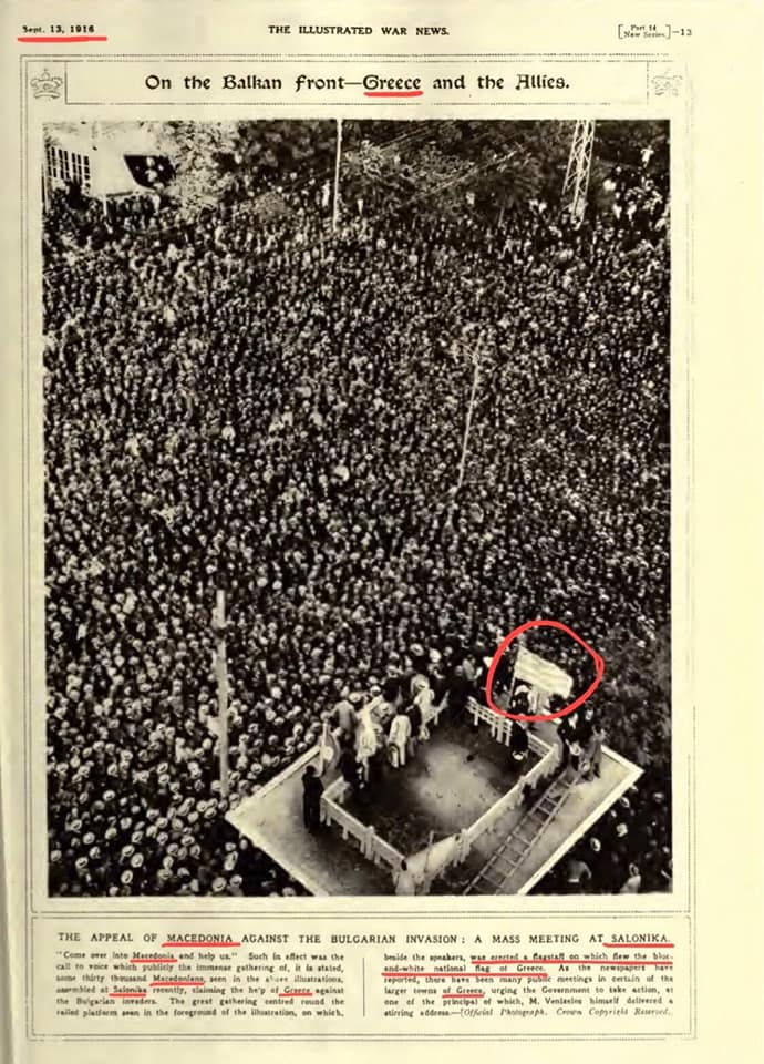 1916. Το αγγλικό εβδομαδιαίο περιοδικό The Illustrated War News μεταδίδει από την Θεσσαλονίκη φωτογραφίες και αναφέρει 30.000 Μακεδόνες που διαδήλωσαν στη Μακεδονία με ελληνικές σημαίες, ζητώντας παρέμβαση της ελληνικής κυβέρνησης εναντίον των Βουλγάρων που εποφθαλμιούν την πόλη τους και τη Μακεδονία. Ημερομηνία έκδοσης 13.9.1916. Σπάνιο εύρημα! (*)