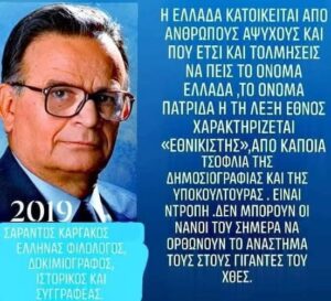 Ο Σαράντος Καργάκος υπήρξε ένας από τους πιο ένθερμους υπερασπιστές της ελληνικής Ιστορίας, της παράδοσης και των αξιών που συγκροτούν την ψυχή του έθνους. Στο παραπάνω απόσπασμα, η φωνή του ακούγεται σαν συναγερμός που προειδοποιεί για μια κοινωνία που έχει χάσει την πνοή της, που ντρέπεται να πει τη λέξη «πατρίδα», που φοβάται τη λέξη «έθνος» και που αρκείται να αμαυρώνει την δόξα των προγόνων της. Ο Καργάκος δεν μιλά μόνο για έλλειψη πίστης στον εαυτό μας, μιλά για μια επίθεση εκ των έσω, από εκείνους που υποτίθεται ότι υπηρετούν την κοινωνία και την αλήθεια.