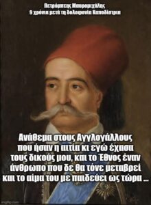 «Δεν μετράς καλά, φιλόσοφε. Ανάθεμα στους Αγγλογάλλους που ήσαν η αιτία κι εγώ έχασα τους δικούς μου και το Έθνος έναν άνθρωπο που δε θα τονε ματαβρεί (Ιωάννη Καποδίστρια). Και το αίμα του με παιδεύει ως τώρα…».