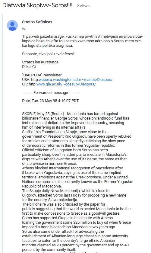 ✅Το 1995 ήταν αποδεκτό από όλους (κυβέρνηση και τύπο των Σκοπίων, Reuters, Έλληνες σχολιαστές όλου του πολιτικού φάσματος) χωρίς ενδοιασμό ή περιστροφές ή ίχνος ότι πρόκειται για αστήρικτη συνωμοσία για το γεγονός ότι ο Σόρος χρηματοδοτεί τα Σκόπια. Η είδηση του Reuters αναφέρει μέχρι και χρήματα προς τα Σκόπια για να αποφύγουν το ελληνικό εμπάργκο.