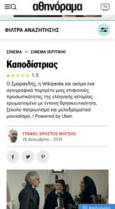 Η συγκεκριμένη κριτική στο Αθηνόραμα για την τελευταία ταινία του Γιάννη Σμαραγδή δεν πάσχει επειδή είναι αυστηρή, πάσχει επειδή είναι θολή, ιδεολογικά προδιαγεγραμμένη και αισθητικά αυτάρεσκη. Δεν επιχειρεί να αναλύσει την ταινία ως κινηματογραφικό έργο, αλλά να τη σηματοδοτήσει πολιτισμικά να την κατατάξει γρήγορα και αβασάνιστα στη λάθος πλευρά του προσωπικού τους “ελιτίστικου” γούστου.