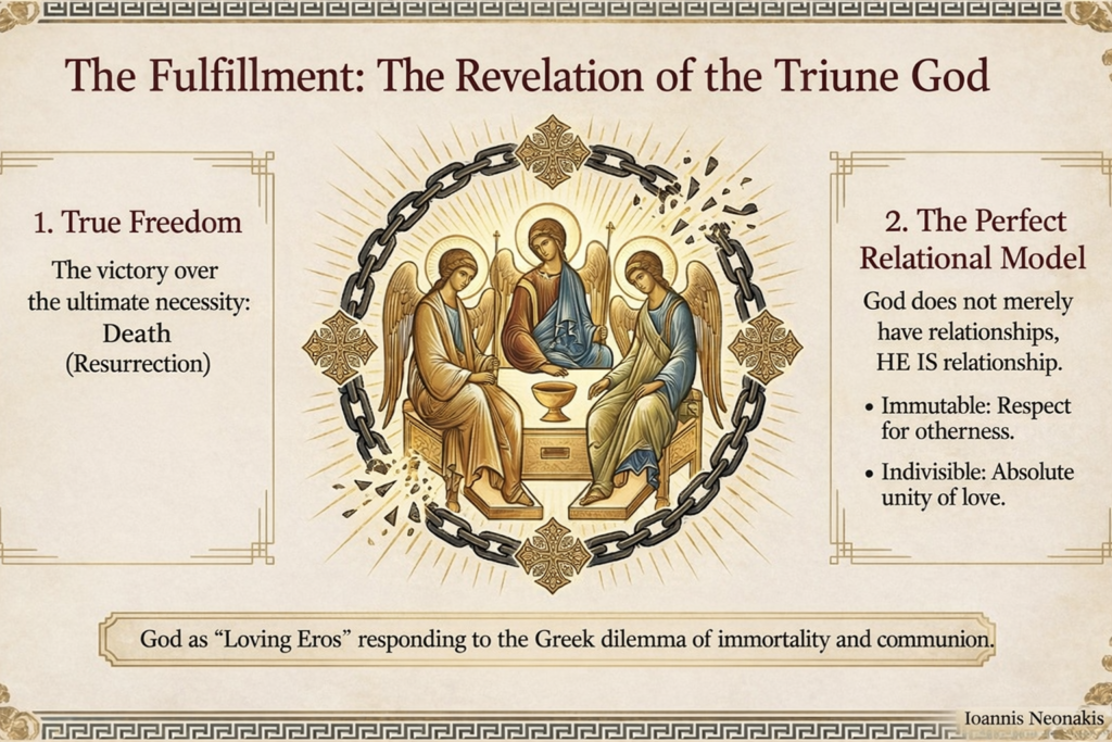 What the Hellenic intellect had long awaited was fulfilled—indeed fulfilled in perfection—when the God of the Christians was revealed to the Hellenic world. For this God bestowed upon the Hellenic soul the two things it most deeply desired: freedom from all necessity and an inconceivable model of personal communion. This God possesses an incomprehensible freedom, subject to no limitation. His Incarnation constitutes a transcendence of nature itself, while His Resurrection constitutes liberation from the ultimate necessity of death. Yet most astonishing of all is this: this God is not merely a person who has relationships; He Himself is relationship. The God of the Christians is defined as relationship—indeed, as relationship of ecstatic love: an indivisible, loving, ontological unity of three persons (“without division”), without confusion or absorption of otherness (“without confusion”). The Hellenes received this God with joy and were intoxicated with the “sober intoxication” of revelatory light. They tasted and celebrated the endless feast of the ecclesial event and sought, as far as they were able, to shape their relationships—both individually and collectively—according to the Trinitarian mode of “without confusion and without division.” Thus Hellenism evolved into a new way of life, into a new Hellenicity, into a new civilization: that of Romeosyne.
