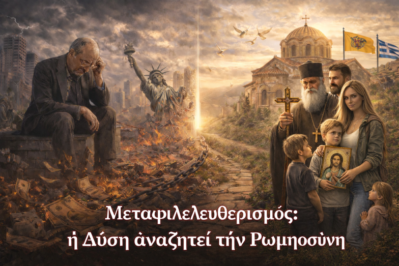 Αὐτὸ ποὺ ἡ Δύση (Εὐρώπη καὶ εὐρωγενὴς κόσμος) βαπτίζει σήμερα «μεταφιλελευθερισμό» δὲν εἶναι μία νέα σοφία. Εἶναι ἡ ἀμήχανη παραδοχὴ τῆς ἀποτυχίας της. Ἀφοῦ διέλυσε τὴν κοινότητα, τὴν οἰκογένεια καὶ τὴν πίστη, ἀναζητεῖ τώρα – ἔστω καὶ ἀσυνείδητα – οὐσιαστικά τὶς ρωμαίικες ρίζες της, τις ὁποῖες ἀπώλεσε στο πέρασμα τῶν αἰώνων κυρίως ὑπό το βάρος καταρχήν τῆς Φραγκοσύνης και τῆς συνακόλουθης Παποσύνης. Ἀναζητεῖ τὶς ρίζες ποὺ ἐμεῖς γνωρίζουμε ἐδῶ καὶ αἰῶνες ὡς Ρωμηοσύνη. Ἡ Ρωμηοσύνη δὲν εἶναι ἰδεολογία οὔτε πολιτικὸ ρεύμα, ἀλλὰ ὁ ζωντανὸς τρόπος ὑπάρξεως τοῦ Γένους μας.