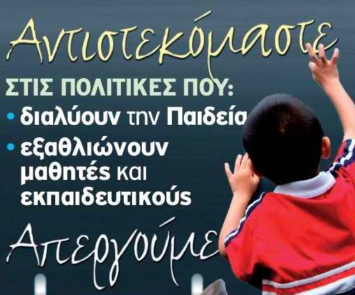 Φαίνεται όμως πως δεν είναι αρκετή η κοινωνική κατάκριση και ο στιγματισμός για να μας παραδειγματίσουν και να μας συνετίσουν … Είναι ακόμη θλιβερότερο όταν η ίδια η Πολιτεία μας αμφισβητεί κατάφωρα. Είναι ακόμη πιο αποτρόπαιο όταν με καιροσκοπισμό ποδηγετείται η κοινή γνώμη ενάντια στους «αδηφάγους» και «οκνηρούς» καθηγητές και με νόμους «νέας κοπής» κατακρεουργείται ό,τι απέμεινε από το λεηλατημένο ελληνικό σχολείο… Ποιος δε συνειδητοποιεί ότι χτυπώντας τους καθηγητές τελικά πληγώνεται και προσβάλλεται η νέα γενιά;